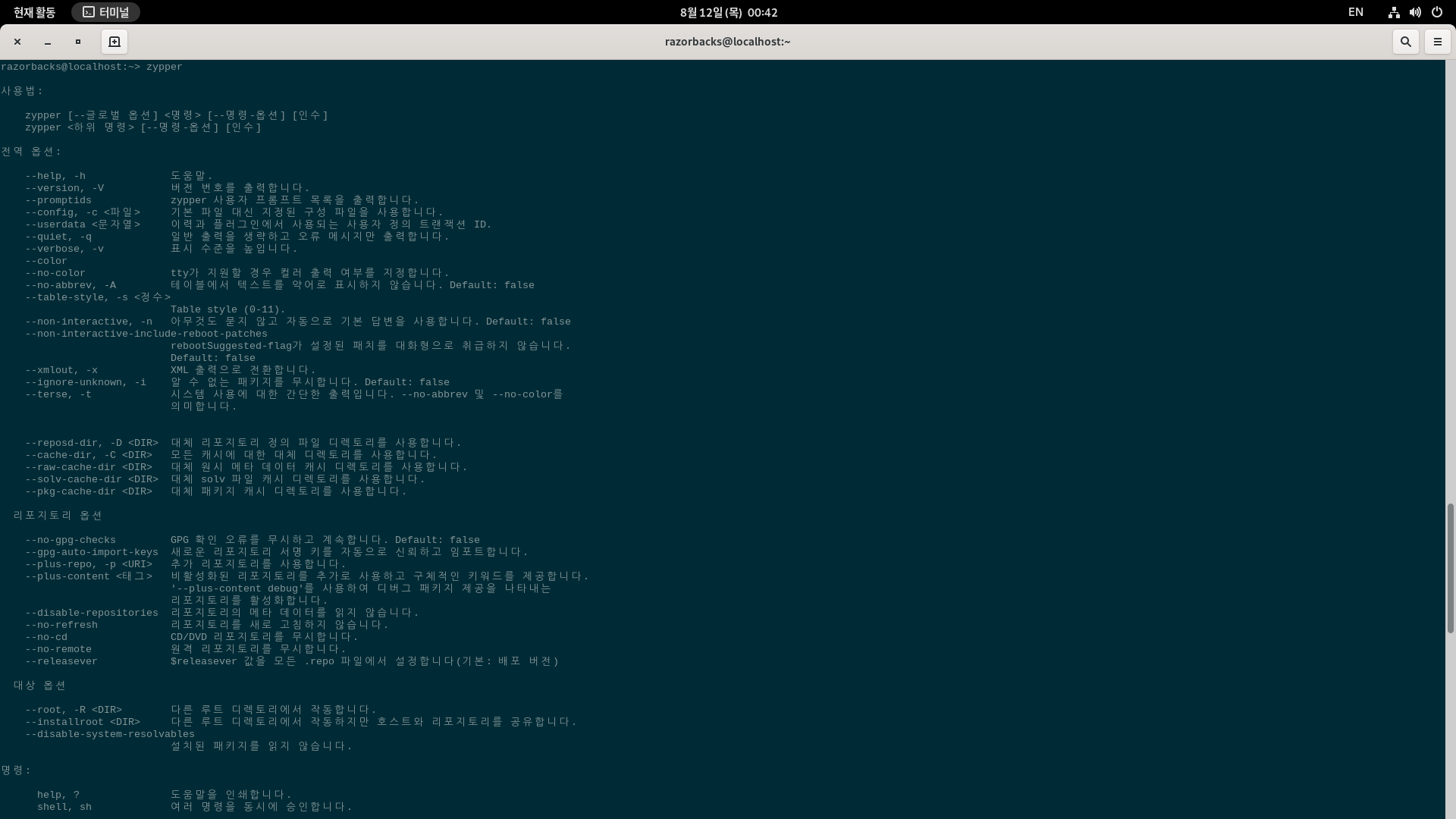입력한 [명령어]의 도움말을 보여주거나, [명령어] 를 입력하지 않을 경우에는 위의 zypper 와 동일한 내용이 출력됩니다.